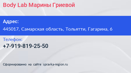 Body Lab Марины Гриевой по адресу 445017, Самарская область, Тольятти, Гагарина, 6 в дальнейшем Организация, размещена в следующих категориях: