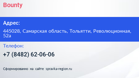 Bounty по адресу 445028, Самарская область, Тольятти, Революционная, 52а в дальнейшем Организация, размещена в следующих категориях: