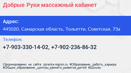 Добрые Руки, массажный кабинет по адресу 445020, Самарская область, Тольятти, Советская, 73а в дальнейшем Организация, размещена в следующих категориях: