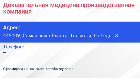 Доказательная медицина, производственная компания по адресу 445009, Самарская область, Тольятти, Победы, 8 в дальнейшем Организация, размещена в следующих категориях: