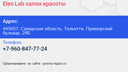 Elen Lab, салон красоты по адресу 445057, Самарская область, Тольятти, Приморский бульвар, 29Б в дальнейшем Организация, размещена в следующих категориях: