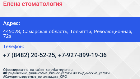 Елена, стоматология по адресу 445028, Самарская область, Тольятти, Революционная, 72а в дальнейшем Организация, размещена в следующих категориях: