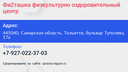ФиZташка, физкультурно-оздоровительный центр по адресу 445040, Самарская область, Тольятти, бульвар Туполева, 17а в дальнейшем Организация, размещена в следующих категориях: