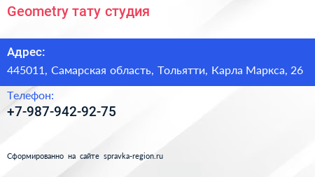 Geometry, тату-студия по адресу 445011, Самарская область, Тольятти, Карла Маркса, 26 в дальнейшем Организация, размещена в следующих категориях: