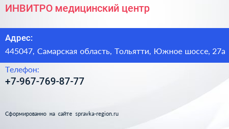 ИНВИТРО, медицинский центр по адресу 445047, Самарская область, Тольятти, Южное шоссе, 27а в дальнейшем Организация, размещена в следующих категориях: