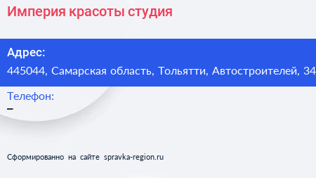 Империя красоты, студия по адресу 445044, Самарская область, Тольятти, Автостроителей, 34 в дальнейшем Организация, размещена в следующих категориях:
