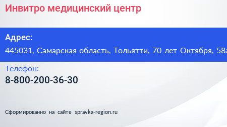 Инвитро, медицинский центр по адресу 445031, Самарская область, Тольятти, 70 лет Октября, 58а в дальнейшем Организация, размещена в следующих категориях:
