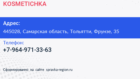 KOSMETICHKA по адресу 445028, Самарская область, Тольятти, Фрунзе, 35 в дальнейшем Организация, размещена в следующих категориях: