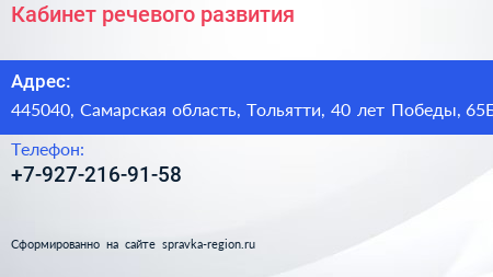 Кабинет речевого развития по адресу 445040, Самарская область, Тольятти, 40 лет Победы, 65Б в дальнейшем Организация, размещена в следующих категориях: