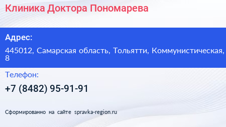 Клиника Доктора Пономарева по адресу 445012, Самарская область, Тольятти, Коммунистическая, 8 в дальнейшем Организация, размещена в следующих категориях:
