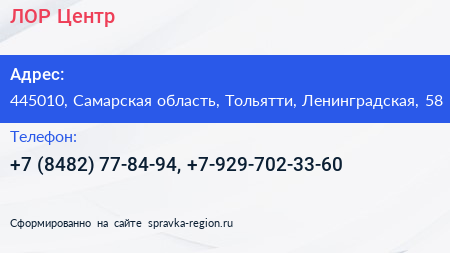 ЛОР-Центр по адресу 445010, Самарская область, Тольятти, Ленинградская, 58 в дальнейшем Организация, размещена в следующих категориях: