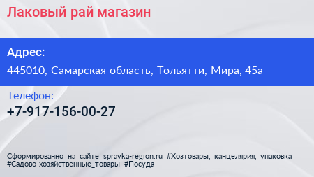 Лаковый рай, магазин по адресу 445010, Самарская область, Тольятти, Мира, 45а в дальнейшем Организация, размещена в следующих категориях: