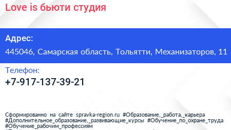 Love is..., бьюти-студия по адресу 445046, Самарская область, Тольятти, Механизаторов, 11 в дальнейшем Организация, размещена в следующих категориях: