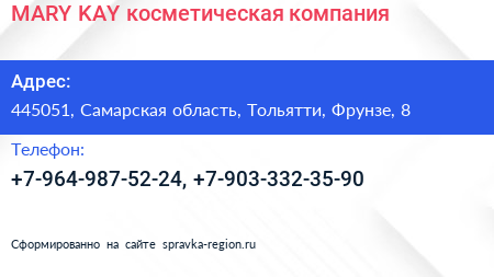 MARY KAY, косметическая компания по адресу 445051, Самарская область, Тольятти, Фрунзе, 8 в дальнейшем Организация, размещена в следующих категориях: