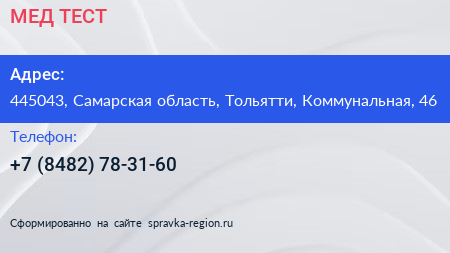 МЕД-ТЕСТ по адресу 445043, Самарская область, Тольятти, Коммунальная, 46 в дальнейшем Организация, размещена в следующих категориях: