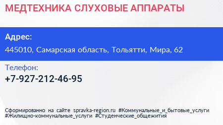 МЕДТЕХНИКА+СЛУХОВЫЕ АППАРАТЫ по адресу 445010, Самарская область, Тольятти, Мира, 62 в дальнейшем Организация, размещена в следующих категориях: