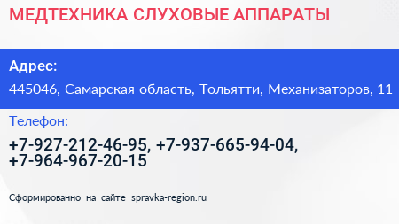 МЕДТЕХНИКА+СЛУХОВЫЕ АППАРАТЫ по адресу 445046, Самарская область, Тольятти, Механизаторов, 11 в дальнейшем Организация, размещена в следующих категориях: