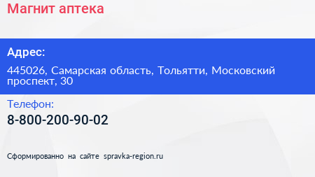 Магнит, аптека по адресу 445026, Самарская область, Тольятти, Московский проспект, 30 в дальнейшем Организация, размещена в следующих категориях: