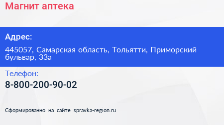 Магнит, аптека по адресу 445057, Самарская область, Тольятти, Приморский бульвар, 33а в дальнейшем Организация, размещена в следующих категориях: