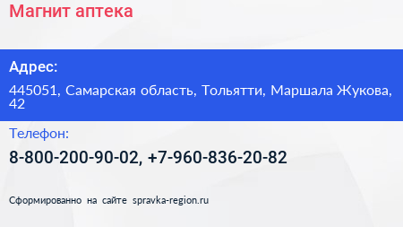 Магнит, аптека по адресу 445051, Самарская область, Тольятти, Маршала Жукова, 42 в дальнейшем Организация, размещена в следующих категориях: