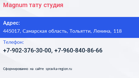 Magnum, тату-студия по адресу 445017, Самарская область, Тольятти, Ленина, 118 в дальнейшем Организация, размещена в следующих категориях: