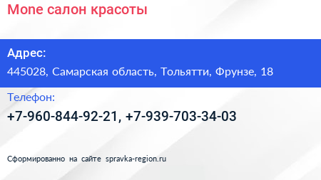 Mone, салон красоты по адресу 445028, Самарская область, Тольятти, Фрунзе, 18 в дальнейшем Организация, размещена в следующих категориях:
