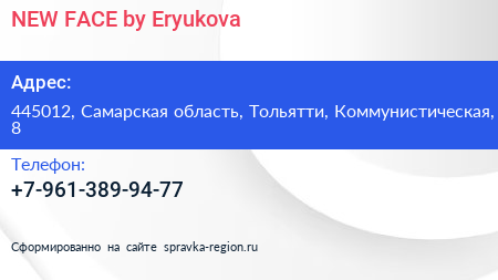 NEW FACE by Eryukova по адресу 445012, Самарская область, Тольятти, Коммунистическая, 8 в дальнейшем Организация, размещена в следующих категориях: