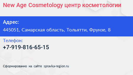 New Age Cosmetology, центр косметологии по адресу 445051, Самарская область, Тольятти, Фрунзе, 8 в дальнейшем Организация, размещена в следующих категориях: