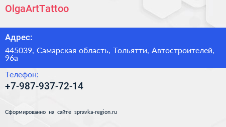 OlgaArtTattoo по адресу 445039, Самарская область, Тольятти, Автостроителей, 96а в дальнейшем Организация, размещена в следующих категориях: