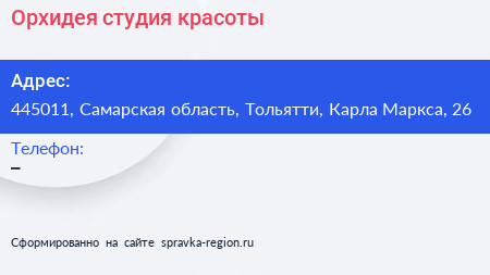 Орхидея, студия красоты по адресу 445011, Самарская область, Тольятти, Карла Маркса, 26 в дальнейшем Организация, размещена в следующих категориях: