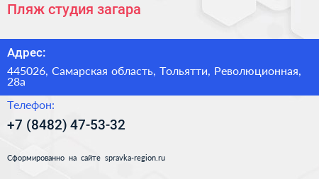 Пляж, студия загара по адресу 445026, Самарская область, Тольятти, Революционная, 28а в дальнейшем Организация, размещена в следующих категориях: