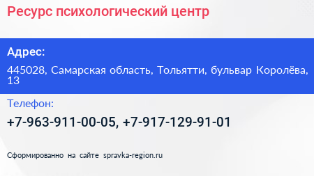 Ресурс, психологический центр по адресу 445028, Самарская область, Тольятти, бульвар Королёва, 13 в дальнейшем Организация, размещена в следующих категориях:
