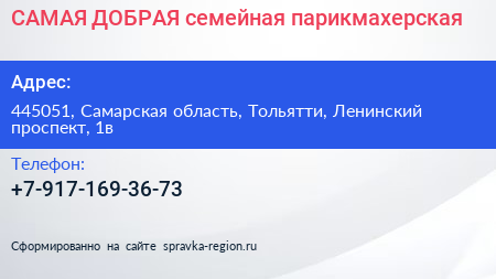 САМАЯ ДОБРАЯ, семейная парикмахерская по адресу 445051, Самарская область, Тольятти, Ленинский проспект, 1в в дальнейшем Организация, размещена в следующих категориях: