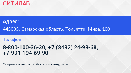 СИТИЛАБ по адресу 445035, Самарская область, Тольятти, Мира, 100 в дальнейшем Организация, размещена в следующих категориях: