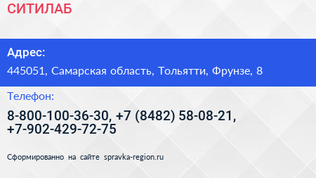 СИТИЛАБ по адресу 445051, Самарская область, Тольятти, Фрунзе, 8 в дальнейшем Организация, размещена в следующих категориях: