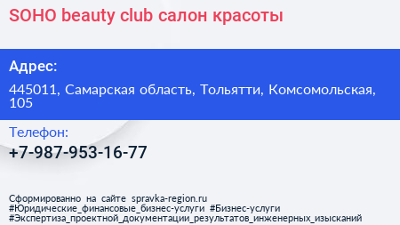 SOHO beauty club, салон красоты по адресу 445011, Самарская область, Тольятти, Комсомольская, 105 в дальнейшем Организация, размещена в следующих категориях: