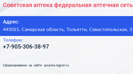 Советская аптека, федеральная аптечная сеть по адресу 445015, Самарская область, Тольятти, Севастопольская, 3 в дальнейшем Организация, размещена в следующих категориях: