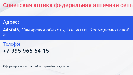 Советская аптека, федеральная аптечная сеть по адресу 445046, Самарская область, Тольятти, Космодемьянской, 3 в дальнейшем Организация, размещена в следующих категориях: