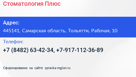 Стоматология Плюс по адресу 445141, Самарская область, Тольятти, Рабочая, 10 в дальнейшем Организация, размещена в следующих категориях: