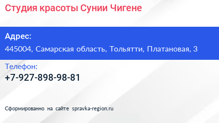 Студия красоты Сунии Чигене по адресу 445004, Самарская область, Тольятти, Платановая, 3 в дальнейшем Организация, размещена в следующих категориях: