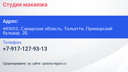 Студия макияжа по адресу 445051, Самарская область, Тольятти, Приморский бульвар, 2Б в дальнейшем Организация, размещена в следующих категориях: