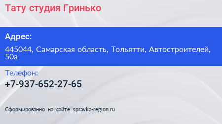 Тату-студия Гринько по адресу 445044, Самарская область, Тольятти, Автостроителей, 50а в дальнейшем Организация, размещена в следующих категориях: