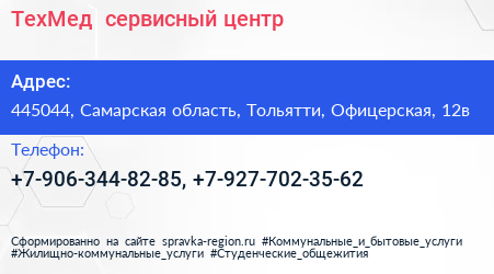ТехМед+, сервисный центр по адресу 445044, Самарская область, Тольятти, Офицерская, 12в в дальнейшем Организация, размещена в следующих категориях: