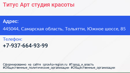 Титус-Арт, студия красоты по адресу 445044, Самарская область, Тольятти, Южное шоссе, 85 в дальнейшем Организация, размещена в следующих категориях: