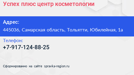 Успех плюс, центр косметологии по адресу 445036, Самарская область, Тольятти, Юбилейная, 1а в дальнейшем Организация, размещена в следующих категориях: