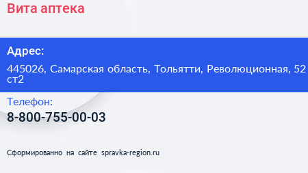 Вита, аптека по адресу 445026, Самарская область, Тольятти, Революционная, 52 ст2 в дальнейшем Организация, размещена в следующих категориях: