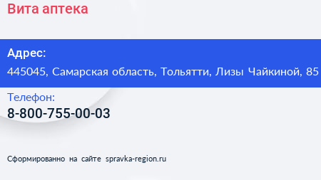 Вита, аптека по адресу 445045, Самарская область, Тольятти, Лизы Чайкиной, 85 в дальнейшем Организация, размещена в следующих категориях: