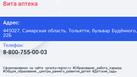 Вита, аптека по адресу 445027, Самарская область, Тольятти, бульвар Будённого, 22Б в дальнейшем Организация, размещена в следующих категориях: