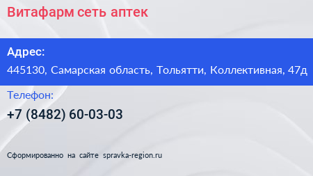Витафарм, сеть аптек по адресу 445130, Самарская область, Тольятти, Коллективная, 47д в дальнейшем Организация, размещена в следующих категориях: