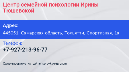 Центр семейной психологии Ирины Тюшевской по адресу 445051, Самарская область, Тольятти, Спортивная, 1а в дальнейшем Организация, размещена в следующих категориях: